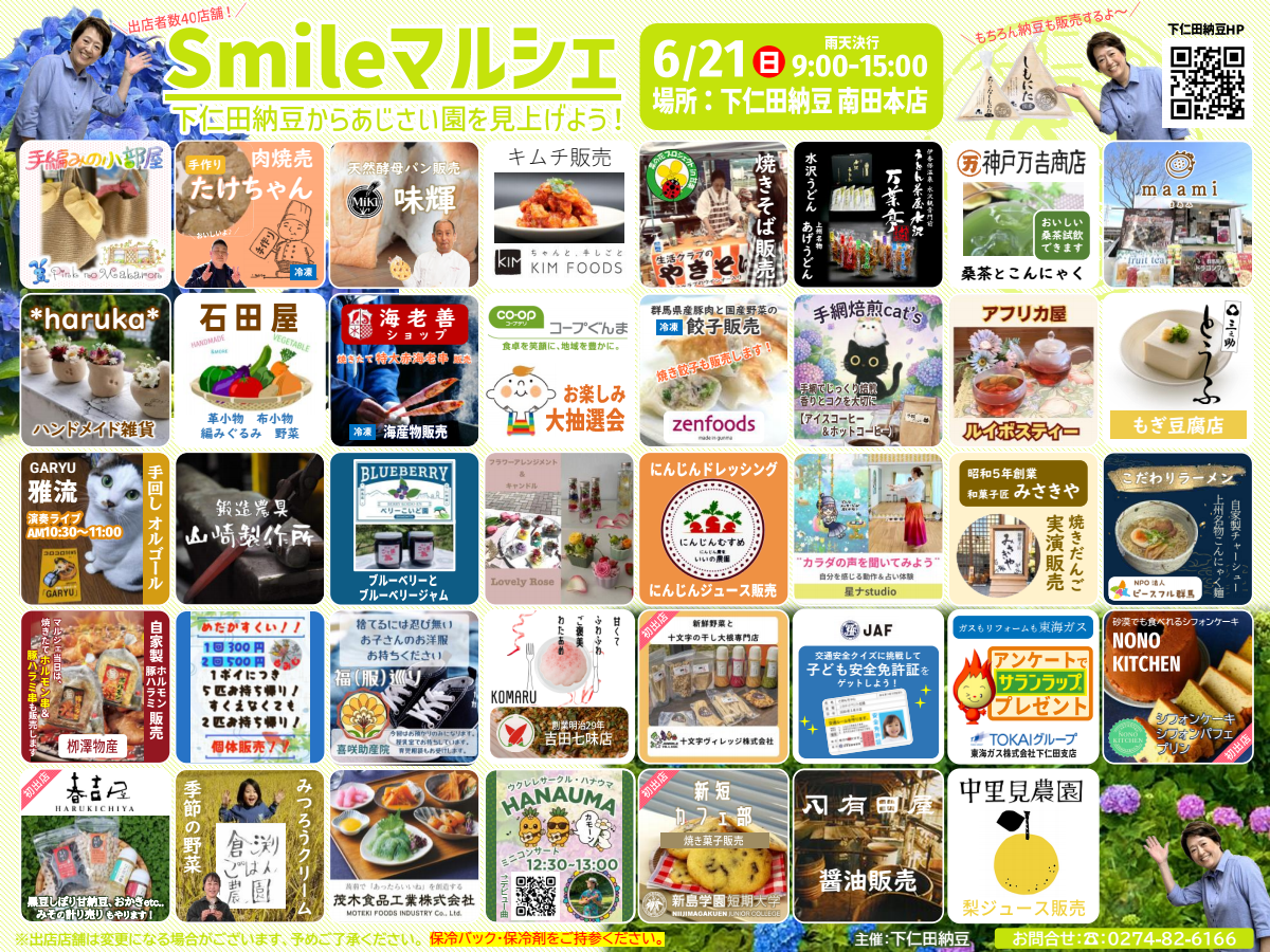 会場である下仁田納豆南田本店は、下仁田あじさい園のすぐ真下!咲き誇るあじさいを眺めた後は、是非マルシェにお立ち寄りください~